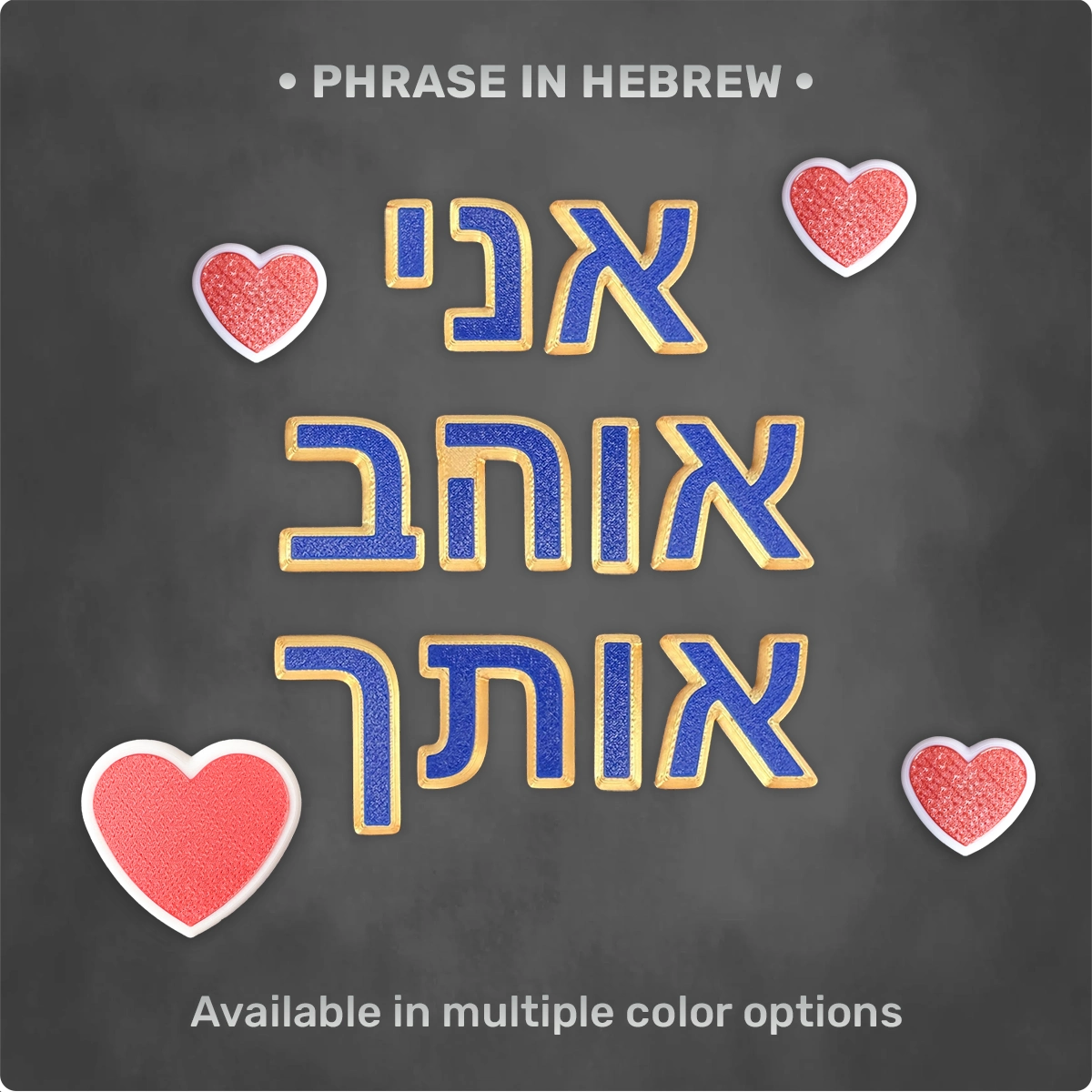 The phrase “אני אוהב אותך” (translation: “I love you”, masculine form) is a heartfelt declaration of love and affection. This magnetic set is designed to bring warmth and emotion into everyday spaces — whether placed on a refrigerator, magnetic board, or any other metal surface.